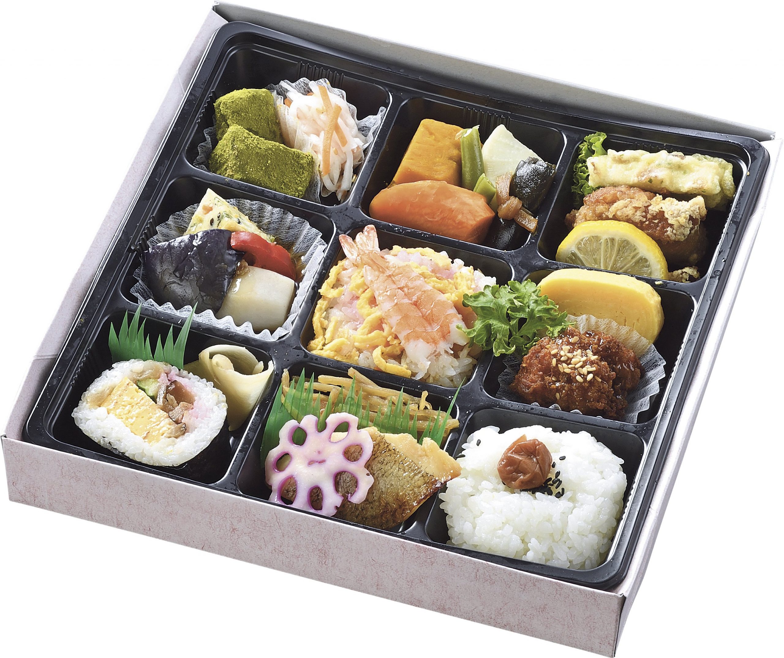 9仕切りのお弁当箱に、3種類のご飯(こだわりちらし寿司、巻き寿司、日の丸ご飯)。揚物、焼物、煮物をバランスよく詰め込んだ、持ち運びしやすい、ほどよい大きさのお弁当です。